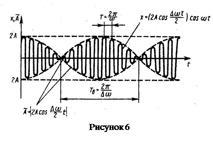 Результирующее колебание (104) можно рассматривать как гармоническое с частотой w, ампли-туда А, которого изменяется по следующему периодическому закону:
