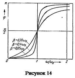 , т.е. j ® 0. Следовательно, фаза смещений почти совпадает с фазой вынуждающей силы. С увеличением w, при w®w0 и tgj ® p /2. Частоте w 0 соответствует j = p /2. Т.е. при резонансе вынужденные колебания отстают по фазе от вынуждающей силы на p/2. Резонансная частота меньше собственной. Следовательно, в момент резонанса j < p/2. При дальнейшем увеличении частоты w, когда w >> w 0, tgj = -2δ/ω и сдвиг фаз становится равным p. Зависимость j от w при разных значениях d показана графически на рисунке 14.