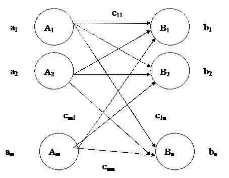 Здесь целевая функция (1) отражает суммарные транспортные расходы. Ограничения (2) требуют, чтобы вся продукция была вывезена, а ограничения (3) – чтобы потребности всех пунктов потребления были удовлетворены. Условие (4) вытекает из физического смысла введенных переменных.