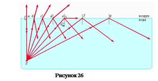 При переходе света из оптически более плотной среды в оптически менее плотную n2 < n1 (например, из стекла в воздух) можно наблюдать явление полного отражения, то есть исчезновение преломленного луча. Это явление наблюдается при углах падения, превышающих некоторый критический угол αпр, который называется предельным углом полного внутреннего отражения На рисунке 26 представлено полное внутреннее отражение света на границе вода–воздух; S – точечный источник света.
