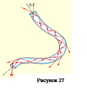 Свет, попадающий на торец световода, может распространяться по нему на большие расстояния за счет полного внутреннего отражения от боковых поверхностей (рис 27). При сильном изгибе волокна закон полного внутреннего отражения нарушается, и свет частично выходит из волокна через боковую поверхность. Научно-техническое направление, занимающееся разработкой и применением оптических световодов, называется волоконной оптикой.