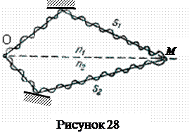 одна волна прошла путь S 1 в среде с показателем преломления n 1, а вторая путь S 2 в среде с показателем преломления n 2. Если в точке О фаза колебаний равна wt, то в точке М первая волна возбудит колебания А1cosw (t-s 1/ v 1), вторая волна – колебания А2cosw (t-s 2/ v 2), где v 1 = c / n 1, v 2 = с / n 2 –соответственно фазовые скорости первой и второй волн. Разность фаз колебаний, возбуждаемых в точке М, равна: