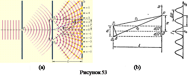 На рисунке 29 изображён опыт Юнга. Две цилиндрические когерентные световые волны (рис.29 a) исходят из действительных или мнимых источников S1и S2, имеющих вид параллельных светящихся тонких нитей, либо узких щелей. Область, в которой эти волны перекрываются, называется полем интерференции. Во всей этой области наблюдается чередование мест с максимальной и минимальной интенсивностью света. Если в поле интерференции внести экран Э, то на нем будет видна интерференционная картина, которая в случае цилиндрических волн имеет вид чередующихся светлых и темных прямолинейных полос. Расчет интерференционной картины от двух источников в точке Р, находящейся на расстоянии l от источников, можно провести, используя две узкие щели, расположенные на малом расстоянии d друг от друга. Источники являются когерентными (рис. 29 b).