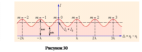 оси y на расстояние, равное ширине интерференционной полосы Δх, т. е. при смещении из одного интерференционного максимума в соседний, разность хода Δ изменяется на одну длину волны λ. Изображенное на рис.30