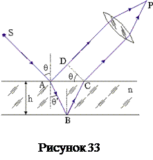Особенно важен частный случай интерференции света, отраженного двумя поверхностями плоскопараллельной пластинки, когда точка наблюдения P находится в бесконечности, т.е. наблюдение ведется либо глазом, аккомодированным на бесконечность, либо на экране, расположенном в фокальной плоскости собирающей линзы (см. рисунок 33). В этом случае оба луча, идущие от S к P, порождены одним падающим лучом и после отражения от передней и задней поверхностей пластинки параллельны друг другу. Оптическая разность хода, возникающая между двумя интерферирующими лучами от точки A до плоскости DC,