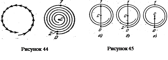 колебания. Амплитуда колебаний, создаваемых такими зонами в точке Р, медленно убывает при переходе от зоны к зоне. Каждое следующее колебание отстает от предыдущего по фазе на одну и ту же величину. Следовательно, векторная диаграмма, получающаяся при сложении колебаний, возбуждаемых отдельными зонами, имеет вид, показанный на рис. 44. Если бы амплитуды, создаваемые отдельными зонами, были одинаковыми, конец последнего из изображенных на рис.44 векторов совпал с началом первого вектора. В действительности значение амплитуды, хотя и очень слабо, убывает, вследствие чего векторы образуют не замкнутую фигуру, а ломаную спиралевидную линию. В пределе при стремлении ширины кольцевых зон к нулю (количество их будет при этом неограниченно возрастать) векторная диаграмма имеет вид спирали, закручивающейся к точке С (рис. 44). Фазы колебаний в точках 0 и 1 отличаются на p (бесконечно малые вектора, образующие спираль, направлены этих точках в противоположные стороны). Следовательно, участок спирали 0 – 1, соответствует первой зоне Френеля. Вектор, проведенный из точки О в точку 1 (рис. 45а), изображает колебание, возбуждаемое в точке Р этой зоной. Аналогично, вектор, проведенный из точки 1 в точку 2 (рис. 45 б), изображает колебание, возбуждаемое второй зоной Френеля. Колебания от первой и второй зон находятся в противофазе; в соответствии с этим векторы 01 и 12 направлены в противоположные стороны. Колебание, возбуждаемое в точке Р всей волновой поверхностью, отображается вектором ОС (рис. 45 в). Из рисунка видно, что амплитуда в этом случае равна половине амплитуды, создаваемой первой зоной. Этот результат мы получили ранее алгебраически.
