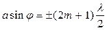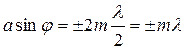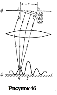 Рассмотрим дифракцию на одной щели в параллельных лучах. Пусть на узкую щель, проделанную в непрозрачном экране, падает нормально к экрану параллельный пучок света. Рассмотрим дифракционную картину вдали от экрана, теоретически - в бесконечности. рассмотрим свет, прошедший через щель под углом j. Оптическая разность хода между крайними лучами, идущими от щели в произвольном направлении D = a sinj. Пусть плоская волна падает перпендикулярно на экран, в котором имеется длинная узкая щель шириной а (рис.46). Когда фронт волны дойдет до щели и займет положение АВ, то все его точки явятся новыми источниками волн, распространяющихся во все стороны вперед от щели. Рассмотрим волны, распространяющиеся от точек плоскости АВ в направлении, составляющем некоторый угол j с первоначальным направлением. При наблюдении их глазом, адаптированным на бесконечность (или через трубу), соответствующие лучи после преломления хрусталиком сойдутся в одну точку на сетчатке и будут интерферировать друг с другом. Можно также поставить линзу, параллельную плоскости АВ, и тогда, как показано на этом же рисунке, эти параллельные лучи после преломления сойдутся в некоторой точке М в фокальной плоскости линзы. Располагая в этой фокальной плоскости экран Е, можно на нем наблюдать результат интерференции для волн, распространяющихся от щели под различными произвольными углами j к первоначальному направлению. Разобьем волновую поверхность, вырезаемую щелью, на зоны Френеля, при этом разность хода между двумя пучками света от соседних зон будет равна l/2. Следовательно, при интерференции они должны гасить друг друга. Допустим, что угол j выбран таким образом, что на щели укладывается четное число зон Френеля. Свет от каждой зоны будет погашен светом соседней зоны, и под таким углом в бесконечности должен наблюдаться минимум. Условие минимума имеет вид:
