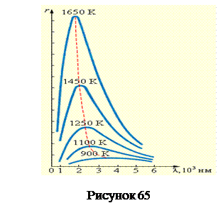 r(λ, T) излучения черного тела при различных температурах, представлены на рисунке 65. Исследования показали, что при каждом значении температуры T зависимость r(λ, T) имеет ярко выраженный максимум (рис.65). С увеличением температуры максимум смещается в область коротких длин волн, причем произведение температуры T на длину волны λm, соответствующую максимуму, остается постоянным: