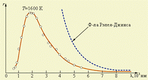 Сравнение закона распределения энергии по длинам волн r(λ, T) в излучении абсолютно черного тела с формулой Рэлея–Джинса при T = 1600 К приведено на рисунке 66. Из рисунка следует, что формула Рэлея — Джинса согласуется с экспериментальными данными только в области достаточно длинных волн (рис. 90). Кроме того, из нее следует абсурдный вывод о том, что интегральная светимость R(T) черного тела должна обращаться в бесконечность, а следовательно, равновесие между нагретым телом и излучением в замкнутой полости может установиться только при абсолютном нуле температуры.