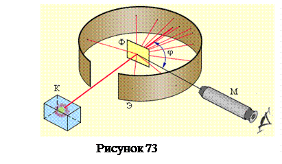 Резерфорд в своих опытах бомбардировал атомы тяжелых элементов (золото, серебро, медь и др.) α-частицами. Электроны, входящие в состав атомов, вследствие малой массы не могут заметно изменить траекторию α-частицы. Рассеяние, то есть изменение направления движения α-частиц, может вызвать только тяжелая положительно заряженная часть атома. Схема опыта Резерфорда по рассеянию α-частиц представлена на рисунке 73: K – свинцовый контейнер с радиоактивным веществом, Э – экран, покрытый сернистым цинком, Ф – золотая фольга, M – микроскоп.