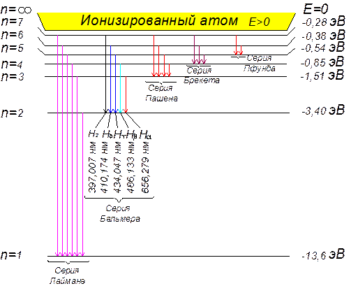 Для наглядного представления возможных энергетических состояний атомов используются энергетические диаграммы (рисунок 74). На них каждое стационарное состояние атома отмечается горизонтальной линией, называемой энергетическим уровнем. Самый низкий уровень на диаграмме с n =1 соответствует основному состоянию. Уровни с n > 1 располагаются выше и называются возбужденными. Атом водорода обладает минимальной энергией