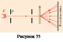 В следующем 1928 году английский физик Дж.Томсон (сын Дж.Томсона, открывшего за 30 лет до этого электрон) получил новое подтверждение гипотезы де Бройля. В своих экспериментах Томсон наблюдал дифракционную картину, возникающую при прохождении пучка электронов через тонкую поликристаллическую фольгу из золота. Упрощенная схема опытов Дж. Томсона по дифракции электронов представлена на рисунке 75. На этом рисунке K – накаливаемый катод, A – анод, Ф – фольга из золота. На установленной за фольгой фотопластинке отчетливо наблюдались концентрические светлые и темные кольца, радиусы которых изменялись с изменением скорости электронов (т. е. длины волны) согласно де Бройлю (рисунок 75).