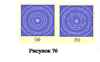 Это нерелятивистский случай, т. к. кинетическая энергия электрона eU = 100 эВ много меньше энергии покоя m0c2 ≈ 0,5 МэВ. Расчет дает значение λ ≈ 0,1 нм, т. е. длина волны как раз оказывается порядка размеров атома. Для таких электронов кристаллическое вещество является хорошей дифракционной решеткой. Именно такие мало энергичные электроны дают отчетливую дифракционную картину в опытах по дифракции электронов. В то же время такой электрон, испытавший дифракционное рассеяние на кристалле как волна, взаимодействует с атомами фотопластинки как частица, вызывая почернение фотоэмульсии в какой-то определенной точке. На рисунке 76 представлена наблюдавшаяся в таких опытах картина дифракции электронов на поликристаллическом образце при длительной экспозиции (a) и при короткой экспозиции (b). В случае (b) видны точки попадания отдельных электронов на фотопластинку.