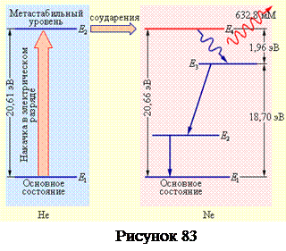 Первый гелий-неоновый лазер был создан в 1961 году. На рис. 83 представлена упрощенная схема уровней гелия и неона и механизм создания