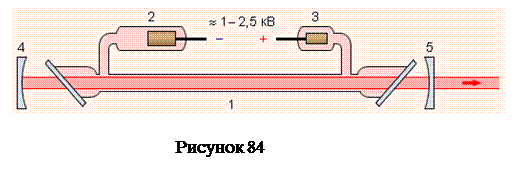 инверсной населенности лазерного перехода. Прямыми стрелками изображены спонтанные переходы в атомах неона. Накачка лазерного перехода E4 → E3 в неоне осуществляется следующим образом. В высоковольтном электрическом разряде вследствие соударений с электронами значительная часть атомов гелия переходит в верхнее метастабильное состояния E2. Возбужденные атомы гелия неупруго сталкиваются с атомами неона, находящимися в основном состоянии, и передают им свою энергию. Уровень E4 неона расположен на 0,05 эВ выше метастабильного уровня E2 гелия. Недостаток энергии компенсируется за счет кинетической энергии соударяющихся атомов. На уровне E4 неона возникает инверсная населенность по отношению к уровню E3, который сильно обедняется за счет спонтанных переходов на ниже расположенные уровни. При достаточно высоком уровне накачки в смеси гелия и неона начинается лавинообразный процесс размножения идентичных когерентных фотонов. Если кювета со смесью газов помещена между высокоотражающими зеркалами, то возникает лазерная генерация. На рисунке 84 изображена схема гелий-неонового лазера: 1 – стеклянная кювета со смесью гелия и неона, в которой создается высоковольтный разряд; 2 – катод; 3 – анод; 4 – глухое сферическое зеркало с пропусканием менее 0,1 %; 5 – сферическое зеркало с пропусканием 1–2 %. Современные высокостабильные гелий-неоновые лазеры производятся в моноблочном исполнении. Для этого используется стеклообразное вещество–