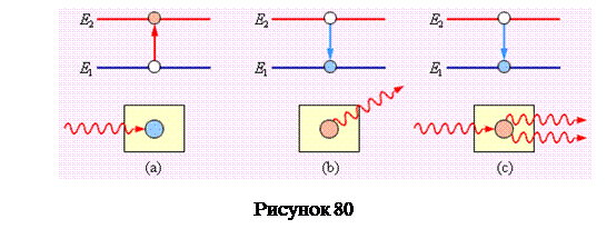 В 1916 году А. Эйнштейн предсказал, что переход электрона в атоме с верхнего энергетического уровня на нижний может происходить под влиянием внешнего электромагнитного поля, частота которого равна собственной частоте перехода. Возникающее при этом излучение называют вынужденным или индуцированным. Вынужденное излучение резко отличается от спонтанного излучения. В результате взаимодействия возбужденного атома с фотоном атом испускает еще один фотон той же самой частоты, распространяющийся в том же направлении. На языке волновой теории это означает, что атом излучает электромагнитную волну, у которой частота, фаза, поляризация и направление распространения точно такие же, как и у первоначальной волны. В результате вынужденного испускания фотонов амплитуда волны, распространяющейся в среде, возрастает. С точки зрения квантовой теории, в результате взаимодействия возбужденного атома с фотоном, частота которого равна частоте перехода, появляются два совершенно одинаковых фотона-близнеца. Именно индуцированное излучение является физической основой работы лазеров. На рисунке 80 схематически представлены возможные механизмы переходов между двумя энергетическими состояниями атома с поглощением (а), спонтанным испусканием кванта (b) и индуцированным испусканием кванта (с). Рассмотрим слой прозрачного вещества, атомы которого могут находиться в состояниях с энергиями E1 и E2 > E1. Пусть в этом слое распространяется излучение резонансной частоты перехода ν = ΔE / h. Согласно распределению Больцмана, при термодинамическом равновесии большее количество атомов вещества будет находиться в нижнем энергетическом состоянии. Некоторая часть атомов будет находиться и в верхнем энергетическом состоянии, получая необходимую энергию при столкновениях с другими атомами. Обозначим населенности нижнего и верхнего уровней соответственно через n1 и n2 < n1. При распространении резонансного излучения в такой среде будут происходить все три процесса, изображенные на рисунке 80. Эйнштейн показал, что процесс (a) поглощения фотона