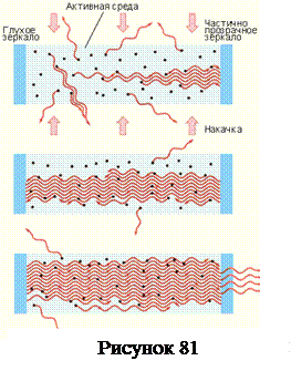 Начало лавинообразному процессу в такой системе при определенных условиях может положить случайный спонтанный акт, при котором возникает излучение, направленное вдоль оси системы. Через некоторое время в такой системе возникает стационарный режим генерации. Это и есть лазер. Лазерное излучение выводится наружу через одно (или оба) из зеркал, обладающее частичной прозрачностью. На рис. 81 схематически представлено развитие лавинообразного процесса в лазере. Существуют различные способы получения среды с инверсной населенностью уровней. В рубиновом лазере используется оптическая накачка. Атомы возбуждаются за счет поглощения света. Но для этого недостаточно только двух уровней. Каким бы мощным не был свет лампы–накачки, число возбужденных атомов не будет больше числа невозбужденных. В рубиновом лазере накачка производится через третий расположенный выше уровень. Схема трёхуровневой накачки приведена