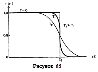 В этой формуле Е - энергия рассматриваемого квантового состояния, EF — энергия Ферми (энергия самого высокого заполненного уровня), k - постоянная Больцмана, Т — абсолютная температура. На рисунке 85 показана функция распределения f(E) при абсолютном нуле температур и при двух более высоких температурах Т. Обратим внимание, что при Е = ЕF, f(E) = 1/2 при всех температурах.