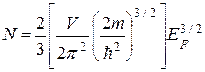 При температуре Т = 0 К, f (Е) = 1 при Е < ЕF, так как все энергетические состояния заполнены до энергетического уровня Е = ЕF. Число электронов с энергиями меньшими или равными энергии Ферми, равно: