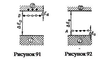 Предположим теперь, что в решетке германия часть атомов германия замещена атомами трехвалентного индия (рисунок 92 ). незаполненные энергетические уровни атомов индия располагаются непосредственно у верхнего края заполненной зоны I на расстоянии DE = 0,015 эВ.. Близость этих уровней к заполненной зоне I приводит к тому, что уже при сравнительно низких температурах электроны из зоны I переходят на примесные уровни.