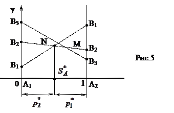 3. Определяется пара стратегий, пересекающихся в точке оптимума. Эти стратегии являются активными стратегиями игрока В. Таким образом, игра (2хn) сведена к игре (2х2).(см. рис.5). Если в точке оптимума пересекаются более двух стратегий, то в качестве активных стратегий может быть выбрана любая пара из них. Решение игры (mx2) осуществляется