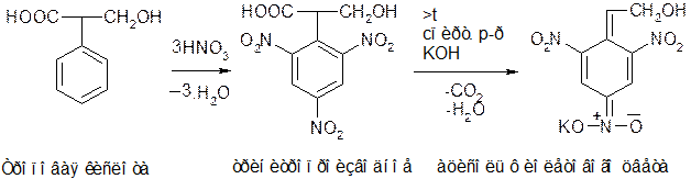 · 1)Реакция Витали-Морена, основана на гидролизе, нитровании и окислении выделившихся кислот (при выпаривании с конц. HNO3), при действии на троповую кислоту раствором КОН (спирт. р-р) и ацетона образуется ацисоль фиолетового цвета (хиноидной структуры)