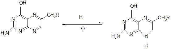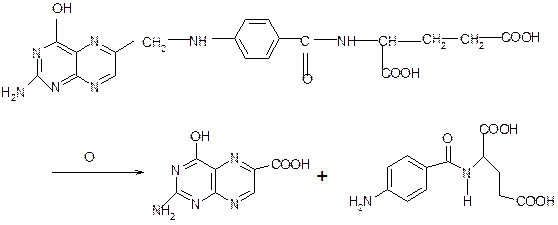 В анализе кислоты фолиевой применяют реакции окисления, комплексообразования, кислотно-основные свойства растворов. При окислении необходимо строгое соблюдение температурного режима. Для испытания подлинности ФС рекомендует использовать ее свойство легко окислятся перманганатом калия при нагревании до 80-85°С. Избыток реактива удаляют действием раствора пероксида водорода, смесь фильтруют и наблюдают характерную голубую флуоресценцию фильтрата в УФ-свете при 254 нм. Испытание основано на образовании n-аминобензоилглутаминовой и птериновой кислот.