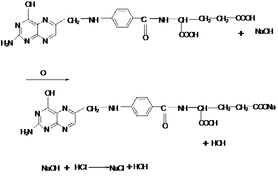 Описано обратное Алкалиметрическое определение кислоты фолиевой. Оно основано на образовании натриевых солей за счет незамещенных карбоксильных групп. Растворяют навеску в избытке 0,1М раствора гидроксида натрия, а затем медленно титруют несвязавшееся количество щелочи 0,1М раствором хлороводородной кислоты. Используют либо смешанный индикатор (фенолфталеин с метиленовым синим), либо тимолфталеин.
