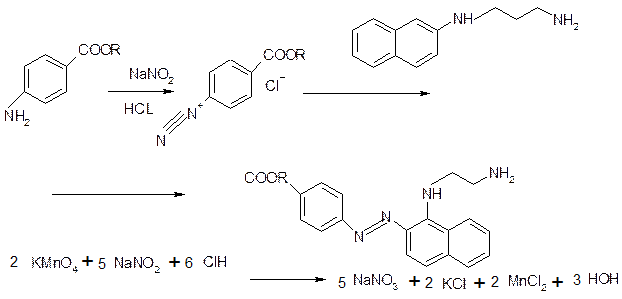 Способ фотоколориметрического определения (по ФС) основан на предварительном окислении перманганатом калия до птериновой и n-аминобензоилглутаминовой кислот (химизм выше). Последнюю затем диазотируют раствором нитрита натрия и сочетают с N-(1-нафтил) - этилендиамином: