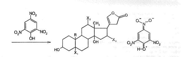 положении в молекуле карденолидов. К их числу относится реакция Легаля, суть которой заключается в образовании окрашенного в красный цвет продукта при взаимодействии сердечного гликозида с раствором нитропруссида натрия в щелочной среде. Эту реакцию ФС рекомендуют для испытания подлинности всех лекарственных препаратов сердечных гликозидов. Пятичленный лактонный цикл можно также обнаружить по образованию окрашенных в красно-фиолетовый цвет продуктов взаимодействия с нитропроизводными ароматического ряда в щелочной среде, например, с м-динитробензолом (реакция Раймонда). Эту реакцию ФС рекомендует для обнаружения агликона в молекуле дигитоксина. Разновидностью данной группы реакций является образование окрашенных в оранжево-красный цвет продуктов взаимодействия сердечный гликозидов со щелочным раствором пикриновой кислоты (реакция Балье):