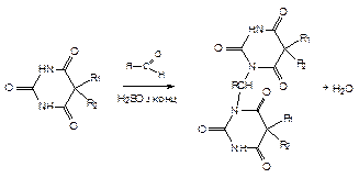 При правильном выборе альдегида эту реакцию можно использовать для идентификации, т.к. различные барбитураты будут давать разный результат. Например, фенобарбитал + формалин Þ образует вишнево-красное кольцо на границе водного слоя и слоя конц. H2SO4. Эта реакция часто используется в методе ТСХ; в качестве детергента используется раствор альдегида + конц. H2SO4 Þ на ТСХ пятна барбитуратов окрашиваются в характерные цвета.