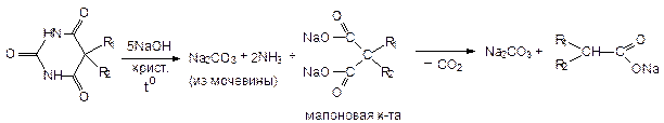 Эту реакцию можно использовать для идентификации, т.к. выделяется аммиак (запах, лакмус) + после подкисления - кислота будет обладать характерным запахом, а из карбонатов будет выделять углекислый газ. Также эта реакция показывает строение барбитуратов, их принадлежность к классу уреидов и те возможные изменения, которые могут возникать в процессе хранения. Как аналитическая реакция не используется.