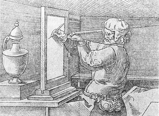 Первым человеком, решившим проблему передачи зрительного восприятия на плоскость, был архитектор Филиппо Брунеллески. Он нашел способ оптико-геометрических построений, произведя сечение зрительной пирамиды Евклида картинной плоскостью и получив тем самым перспективное изображение предмета. Такие точные геометрические построения ренессансной системы перспективы отлично проиллюстрировал своими гравюрами Альбрехт Дюрер (рис. 7).