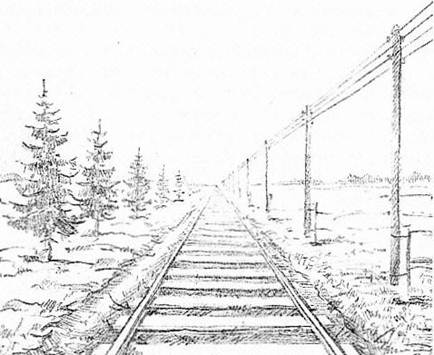 Таким образом, на примере рельсов и шпал можно убедиться в наклонности горизонтальных линий к горизонту. Поэтому при работе над рисунком всегда следует точно определить угол наклона горизонтальных линий.