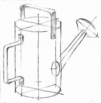 Итак, в окружающем нас мире все предметы характеризуются не только конструктивным строением, но и размерами. Возьмем, например, садовую лейку — предмет сложной комбинированной формы с неполной симметрией частей (рис. 13). При рисовании лейки с натуры важно увидеть, что две ее части — трубка и ручка — расположены в одной вертикальной плоскости, проходящей через ось симметрии цилиндрического корпуса, и тогда в зависимости от поворота модели не будет допущена ошибка при построении изображения. Одновременно рисовальщик обязан следить за соотношением основных величин предмета — его высотой и шириной, определяя их на глаз.