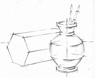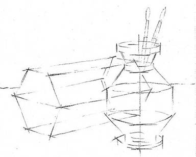 Здесь главное место уделяется определению всей ширины и всей высоты предметов сразу для ограничения поля изображения, тут же намечаются легкими линиями позиции каждого из тел относительно друг друга и плоскость, на которой они поставлены.