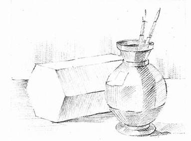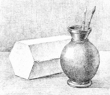 Каждый рисунок является одновременно новым познанием предметного мира, которое сопровождается овладением знаниями, приобретением опыта, новых навыков и моторикой движений руки. Разместив рисунок на плоскости и передав пока в легких линиях границы формы каждого из двух предметов и такими же легкими штрихами наметив объемность вазы и призмы, вы продолжаете работу, переходя к следующему этапу. Теперь вы продолжаете дальше уточнять характерные особенности формы, все время сравнивая рисунок с натурой. Затем приступаете к работе отношениями, предусматривающими определение правильных пропорций, соотношение пространственных планов, деталей и целого.