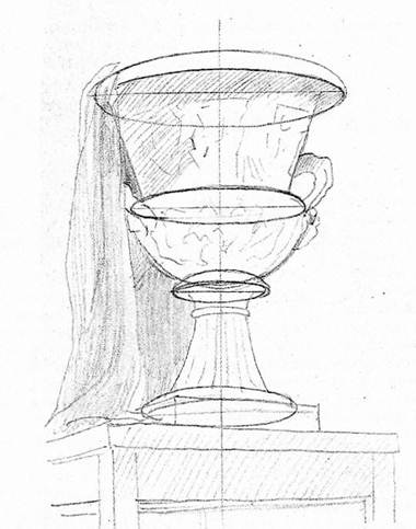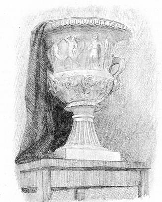 Большая, в метр высотой, гипсовая модель вазы, напоминающая форму древнегреческого глиняного сосуда для смешивания вина с водой, так называемого кратера, — натура, рисовать которую полезно всем, кто хочет быть специалистом в художественной деятельности. Здесь мало точно передать форму и пропорции модели. Сложность возникает потому, что на тулове вазы размещен барельеф с фигурками людей, а ниже — рельефный орнамент растительного мотива, не говоря уже о верхнем основании и сложной ножке кратера.