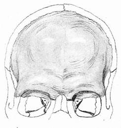 Лобная кость — непарная, хотя у человеческого зародыша она закладывается из правой и левой половин. Затем обе половины срастаются, и почти у каждого черепа в этом месте едва разливается небольшое возвышение, находящееся в вертикальном направлении. В рисовании головы человека лобная кость, форму которой следует изучить, играет в передаче пластики лица важную роль (рис. 43).