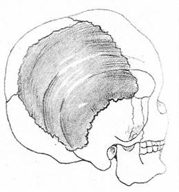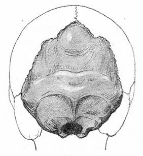 Непарная затылочная кость имеет большое затылочное отверстие, необходимое для позвоночного канала, через который головной мозг сообщается со спинным. Наиболее выступает у затылочной кости наружное затылочное возвышение. От этого возвышения вправо и влево направлены выйные линии — места прикрепления мышц шеи. У некоторых людей на затылочной кости встречается еще один выступ, располагающийся на границе лямбдовидного шва. Знать внешние анатомические свойства затылочной кости необходимо потому, что она входит составной частью в пластическую форму черепа человека (рис. 45).