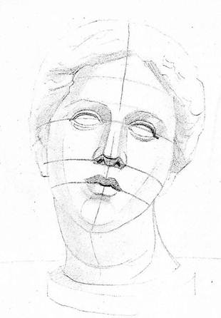 В зависимости от характера строения любая человеческая голова может иметь разную форму — яйцеобразную, грушевидную, шарообразную. Поэтому при построении формы головы следует исходить из характерного признака. У вас уже более-менее развился и устоялся глазомер. Изобразить модель как можно выразительнее — значит проникнуть в суть натуры. В соответствии с освещением натуры выявляются качества формы и подчеркиваются особенности объема головы Афродиты.