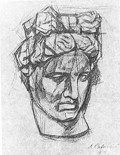 Создавая пластику общего светотеневого состояния модели в своем рисунке, вы становитесь как бы скульпторами, преследующими одну главную цель — добиться правдивости и объемности формы головы античного образца. И как скульптур нигде не задерживается долго в одном месте на доскональной обработке объема, потому что это вредит общему характеру его работы, так и вы в рисунке тоже работаете везде, не отрабатывая до конца отдельный участок изображения. Такая постепенность накопления разнообразных штрихов приводит ваш рисунок в соответствующий вид.