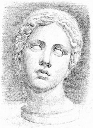 Не пытайтесь сразу вырисовать характерные очертания лица богини, чтобы «поймать» сходство: этого не следует делать, несмотря на большой соблазн. Дело в том, что подобное стремление сразу же незаметно уводит вас от методической последовательности ведения рисунка, вводит в стихию бездумного рисования. Помните, что при правильном распределении задач рисования с натуры все в конце концов встает на свои места: появится сходство, рисунок пойдет по определенному руслу, наступит время творческого подъема и успеха в работе.