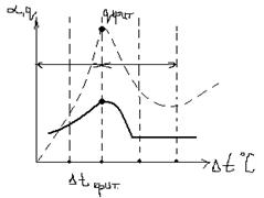 Характер изменения α и q от ∆t иллюстрируется на рисунке. Видно, что α сильно возрастает с увеличением ∆t при пузырьковом режиме кипения, достигает max в критической точке и резко уменьшается при переходе к пленочному режиму и не зависит от ∆t в пленочном режиме.