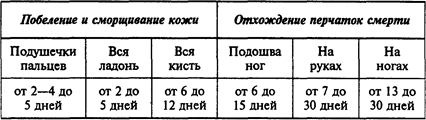 Как видно из вышеприведенной таблицы, сроки появления отдельных признаков мацерации варьируют в довольно широких пределах. Не меньшая вариабельность в сроках появления и развития отдельных изменений наблюдается и при микроскопическом исследовании мацерированной кожи. При этом на быстроту появления изменений оказывает влияние температура воды. Так, набухание рогового слоя с увеличением его клеток наблюдается при температуре +2—4°С уже через 10—12 ч, при +8—10°С время появления указанных изменений уменьшается до 4—6 ч, при +20°С — до 30 мин. Набухание мальпигиева слоя соответственно наблюдается через 4, 6—12 ч, 1—2 суток.