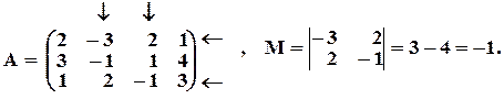 Здесь М минор 2–го порядка матрицы А. Конечно, миноров 2–го порядка в этой матрице много. Миноры 1–го порядка – это просто элементы матрицы, их в нашем примере 12. Миноров 3–го порядка – 4 штуки (строки нужно включать все, а из столбцов один не включать).