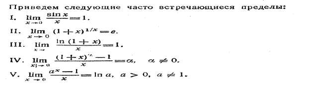 1 –Первый замечательный предел: Читается: предел отношения синуса к его аргументу равен единице, когда аргумент стремится к нулю