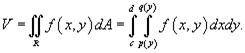 Если f (x,y) > 0 в области интегрирования R, то объем цилиндрического тела с основанием R, ограниченного сверху поверхностью z = f (x,y), выражается формулой