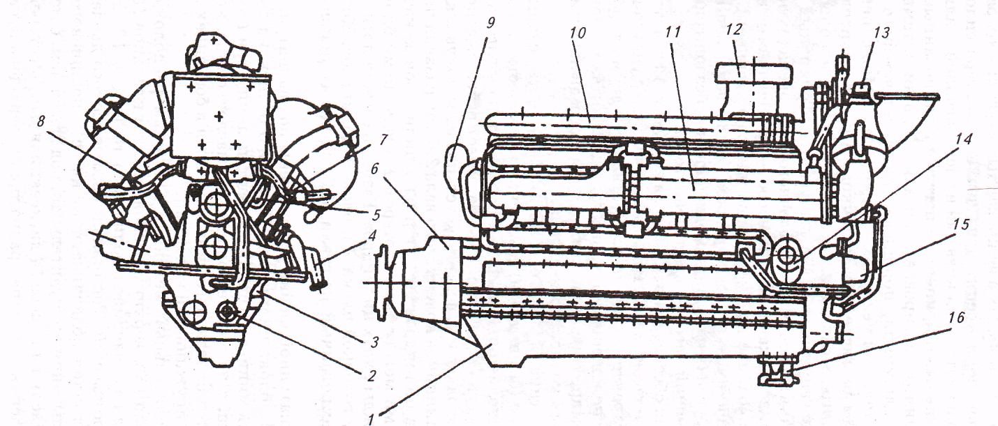 2,3 — нижний и верхний картеры; 2 — двухсекционный насос; 4 — насос 1-го контура; 5 — воздухораспределитель; 6 — носок отбора мощности; 7,8 — правый и левый моноблоки; 9 — топливный фильтр; 10 — кольцевой всасывающий трубопровод; 22 — выпускной коллектор; 12 — воздухозаборный патрубок; 23 — турбокомпрессор; 24, 16 — маслонагнетающий и маслооткачивающий насосы; 25 — центробежное реле скорости