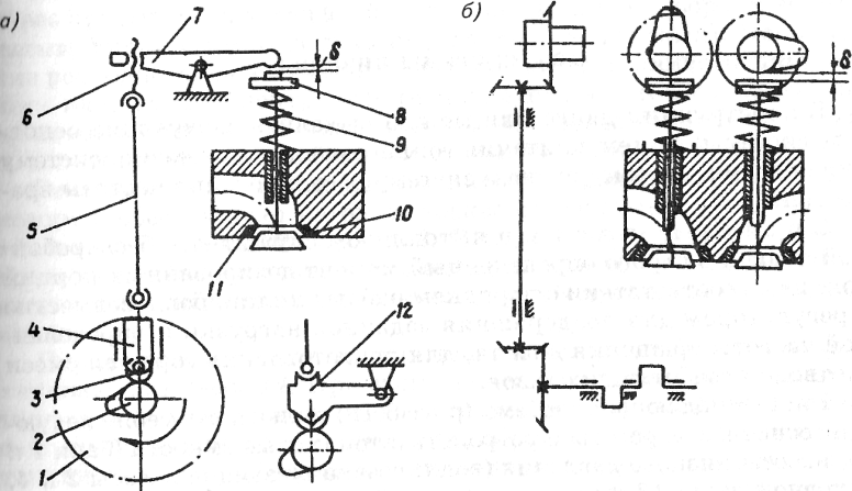 Рис. 4. Газораспределительный механизм: а — с верхним расположением клапанов и нижним расположением кулачкового вала; б — с верхним расположением клапанов и кулачкового вала